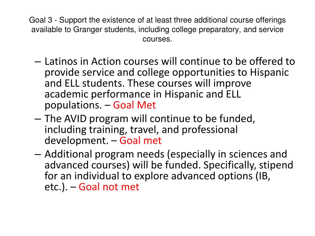 Goal 3 - Support the existence of at least three additional course offerings available to Granger students, including college preparatory, and service courses. • Latinos in Action courses will continue to be offered to provide service and college opportunities to Hispanic and ELL students. These courses will improve academic performance in Hispanic and ELL populations. – Goal Met • The AVID program will continue to be funded, including training, travel, and professional development. – Goal met • Additional program needs (especially in sciences and advanced courses) will be funded. Specifically, stipend for an individual to explore advanced options (IB, etc.). – Goal not met