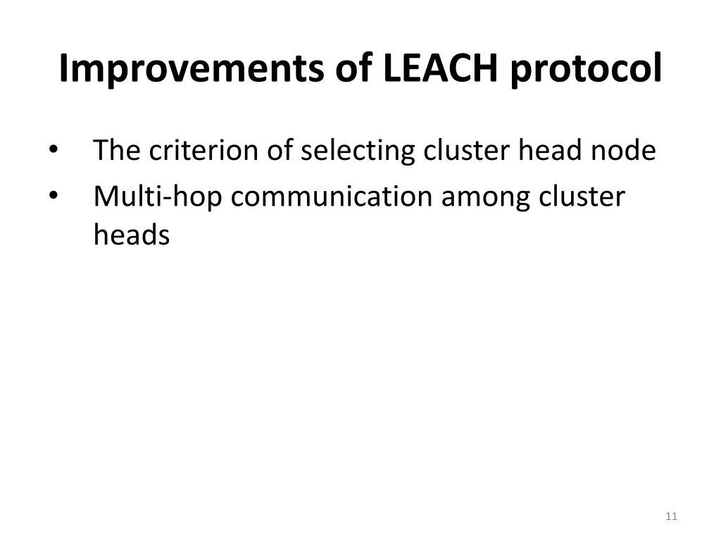 Improvements of LEACH protocol • The criterion of selecting cluster head node • Multi-hop communication among cluster heads