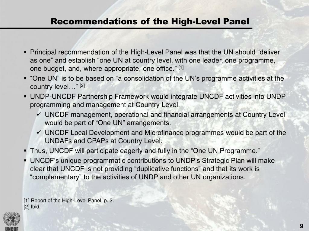Recommendations of the High-Level Panel • Principal recommendation of the High-Level Panel was that the UN should “deliver as one” and establish “one UN at country level, with one leader, one programme, one budget, and, where appropriate, one office.” [1] • “One UN” is to be based on “a consolidation of the UN’s programme activities at the country level…” [2] • UNDP-UNCDF Partnership Framework would integrate UNCDF activities into UNDP programming and management at Country Level. • UNCDF management, operational and financial arrangements at Country Level would be part of “One UN” arrangements. • UNCDF Local Development and Microfinance programmes would be part of the UNDAFs and CPAPs at Country Level. • Thus, UNCDF will participate eagerly and fully in the “One UN Programme.” • UNCDF’s unique programmatic contributions to UNDP’s Strategic Plan will make clear that UNCDF is not providing “duplicative functions” and that its work is “complementary” to the activities of UNDP and other UN organizations. [1] Report of the High-Level Panel, p. 2. [2] Ibid.