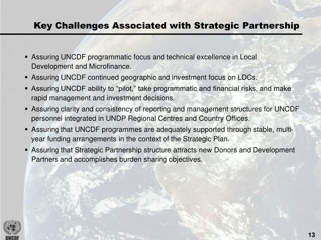 Key Challenges Associated with Strategic Partnership • Assuring UNCDF programmatic focus and technical excellence in Local Development and Microfinance. • Assuring UNCDF continued geographic and investment focus on LDCs. • Assuring UNCDF ability to “pilot,” take programmatic and financial risks, and make rapid management and investment decisions. • Assuring clarity and consistency of reporting and management structures for UNCDF personnel integrated in UNDP Regional Centres and Country Offices. • Assuring that UNCDF programmes are adequately supported through stable, multi-year funding arrangements in the context of the Strategic Plan. • Assuring that Strategic Partnership structure attracts new Donors and Development Partners and accomplishes burden sharing objectives.