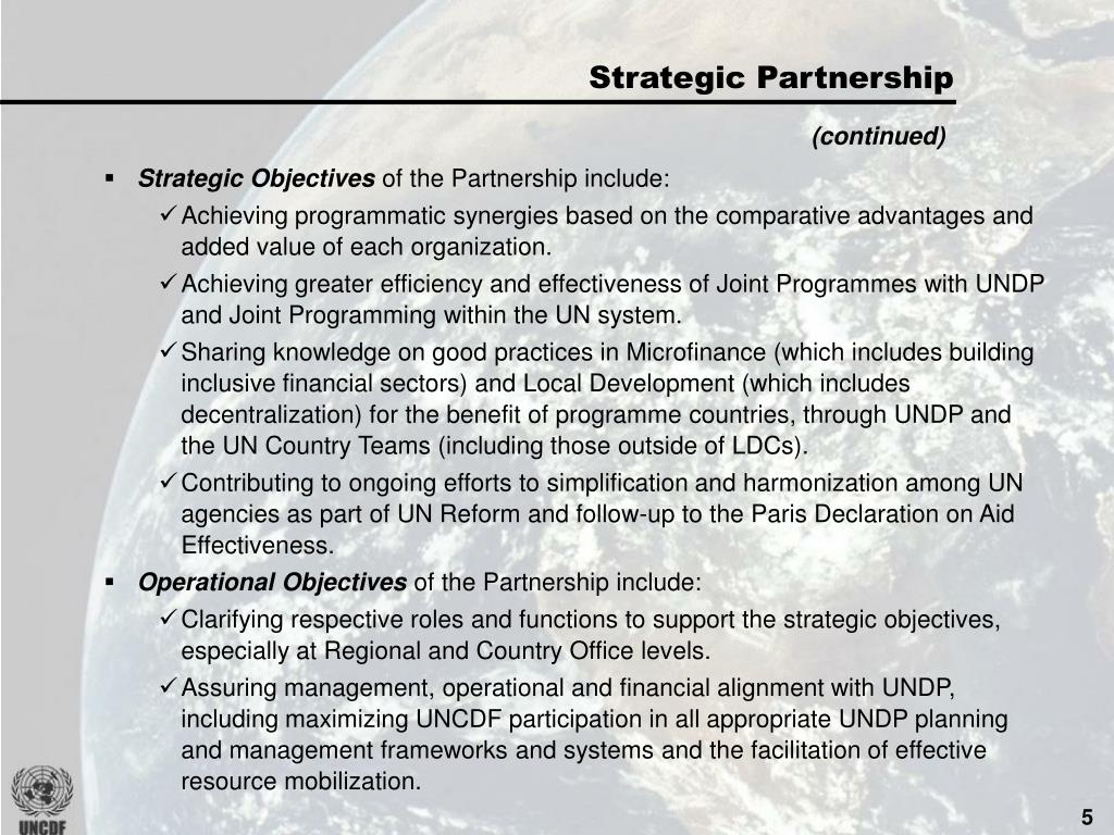 Strategic Partnership (continued) • Strategic Objectives of the Partnership include: • Achieving programmatic synergies based on the comparative advantages and added value of each organization. • Achieving greater efficiency and effectiveness of Joint Programmes with UNDP and Joint Programming within the UN system. • Sharing knowledge on good practices in Microfinance (which includes building inclusive financial sectors) and Local Development (which includes decentralization) for the benefit of programme countries, through UNDP and the UN Country Teams (including those outside of LDCs). • Contributing to ongoing efforts to simplification and harmonization among UN agencies as part of UN Reform and follow-up to the Paris Declaration on Aid Effectiveness. • Operational Objectives of the Partnership include: • Clarifying respective roles and functions to support the strategic objectives, especially at Regional and Country Office levels. • Assuring management, operational and financial alignment with UNDP, including maximizing UNCDF participation in all appropriate UNDP planning and management frameworks and systems and the facilitation of effective resource mobilization.