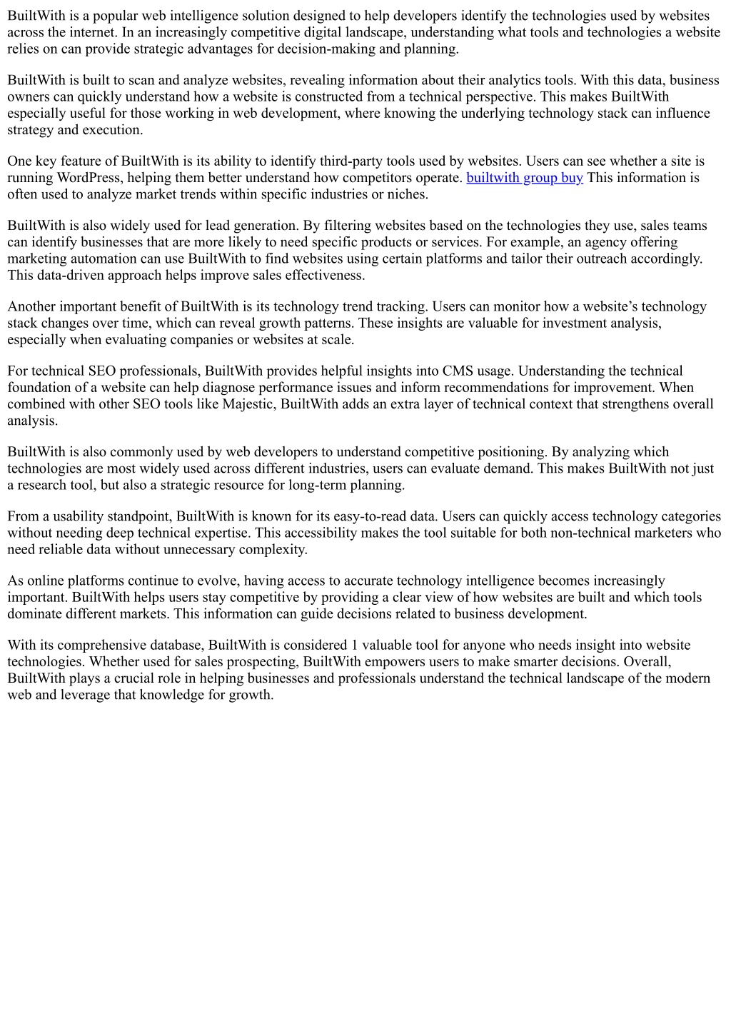 1. BuiltWith is a popular web intelligence solution designed to help developers identify the technologies used by websites across the internet. In an increasingly competitive digital landscape, understanding what tools and technologies a website relies on can provide strategic advantages for decision-making and planning. BuiltWith is built to scan and analyze websites, revealing information about their analytics tools. With this data, business owners can quickly understand how a website is constructed from a technical perspective. This makes BuiltWith especially useful for those working in web development, where knowing the underlying technology stack can influence strategy and execution. One key feature of BuiltWith is its ability to identify third-party tools used by websites. Users can see whether a site is running WordPress, helping them better understand how competitors operate. builtwith group buy This information is often used to analyze market trends within specific industries or niches. BuiltWith is also widely used for lead generation. By filtering websites based on the technologies they use, sales teams can identify businesses that are more likely to need specific products or services. For example, an agency offering marketing automation can use BuiltWith to find websites using certain platforms and tailor their outreach accordingly. This data-driven approach helps improve sales effectiveness. Another important benefit of BuiltWith is its technology trend tracking. Users can monitor how a website’s technology stack changes over time, which can reveal growth patterns. These insights are valuable for investment analysis, especially when evaluating companies or websites at scale. For technical SEO professionals, BuiltWith provides helpful insights into CMS usage. Understanding the technical foundation of a website can help diagnose performance issues and inform recommendations for improvement. When combined with other SEO tools like Majestic, BuiltWith adds an extra layer of technical context that strengthens overall analysis. BuiltWith is also commonly used by web developers to understand competitive positioning. By analyzing which technologies are most widely used across different industries, users can evaluate demand. This makes BuiltWith not just a research tool, but also a strategic resource for long-term planning. From a usability standpoint, BuiltWith is known for its easy-to-read data. Users can quickly access technology categories without needing deep technical expertise. This accessibility makes the tool suitable for both non-technical marketers who need reliable data without unnecessary complexity. As online platforms continue to evolve, having access to accurate technology intelligence becomes increasingly important. BuiltWith helps users stay competitive by providing a clear view of how websites are built and which tools dominate different markets. This information can guide decisions related to business development. With its comprehensive database, BuiltWith is considered 1 valuable tool for anyone who needs insight into website technologies. Whether used for sales prospecting, BuiltWith empowers users to make smarter decisions. Overall, BuiltWith plays a crucial role in helping businesses and professionals understand the technical landscape of the modern web and leverage that knowledge for growth.