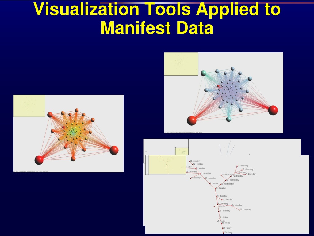 Visualization Tools Applied to Manifest Data Visualizing data can give us insight into interconnections, patterns, and what is “normal” or “abnormal.” Visualization is part of another effort, but similar methods can help with the port reopening problem Our visual analysis methods are based on tools originally developed at AT&T for detection of anomalies in telephone calling patterns – e.g., quick detection that someone has stolen your AT&T calling card. The visualizations are interactive so you can “zoom” in on areas of interest, get different ways to present the data, etc. 19