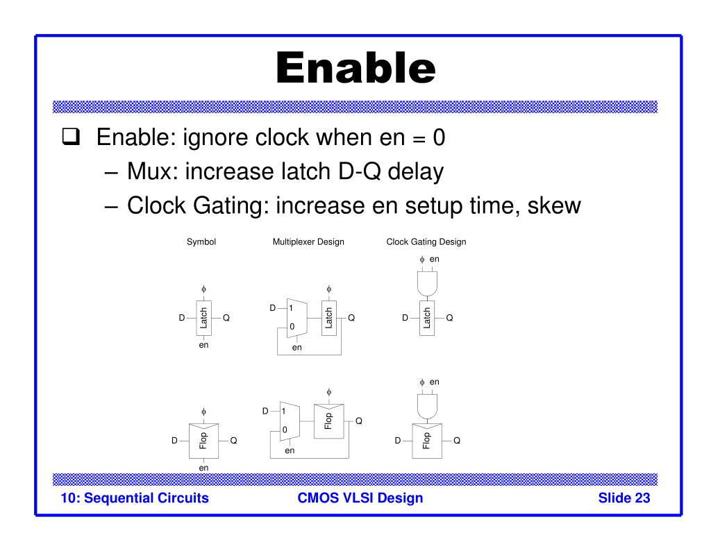 Enable • Enable: ignore clock when en = 0 • Mux: increase latch D-Q delay • Clock Gating: increase en setup time, skew 10: Sequential Circuits