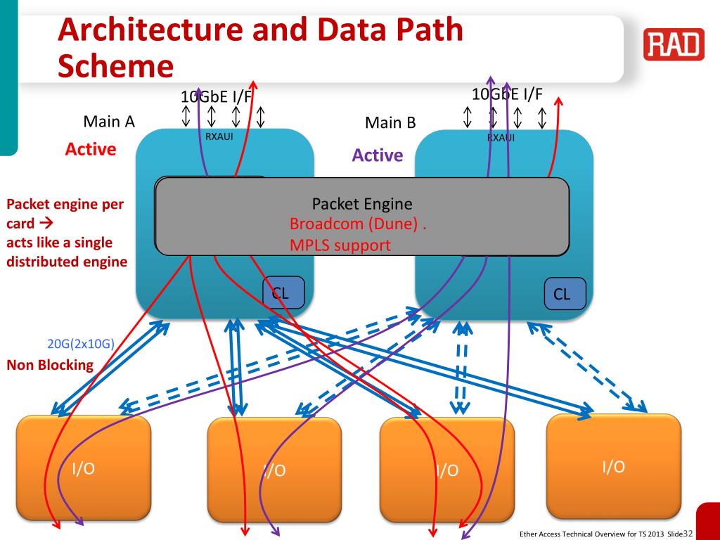 Architecture and Data Path Scheme 10GbE I/F 10GbE I/F 2/4 10G 2/4 10G Main A Main B RXAUI RXAUI Active Active Packet Engine Packet Engine Packet Engine Packet engine per card acts like a single distributed engine Fabric I/F 40Gbps Broadcom (Dune) . MPLS support CL CL 20G(2x10G) Non Blocking I/O I/O I/O I/O