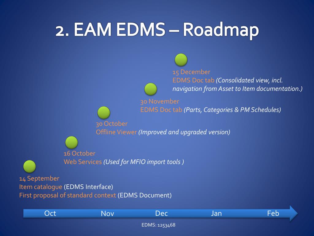 2. EAM EDMS – Roadmap 16 OctoberWeb Services (Used for MFIO import tools ) 30 OctoberOffline Viewer (Improved and upgraded version) 14 September Item catalogue (EDMS Interface) First proposal of standard context (EDMS Document) 3o NovemberEDMS Doc tab (Parts, Categories & PM Schedules) 15 DecemberEDMS Doc tab (Consolidated view, incl. navigation from Asset to Item documentation.) Oct Dec Jan Feb Nov EDMS: 1253468