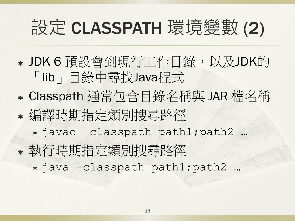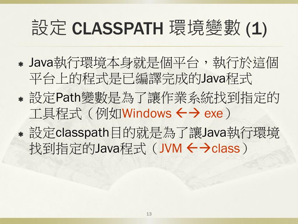 設定 CLASSPATH 環境變數 (1) Java執行環境本身就是個平台,執行於這個平台上的程式是已編譯完成的Java程式 設定Path變數是為了讓作業系統找到指定的工具程式(例如Windows exe) 設定classpath目的就是為了讓Java執行環境找到指定的Java程式(JVM class)