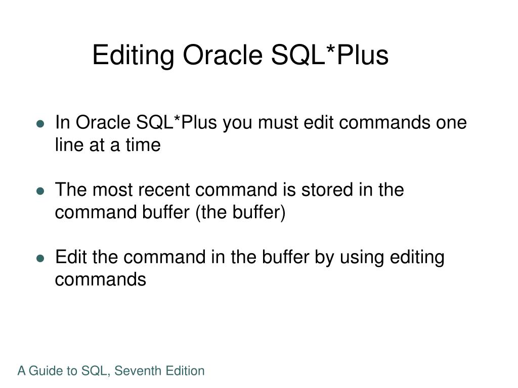 Editing Oracle SQL*Plus • In Oracle SQL*Plus you must edit commands one line at a time • The most recent command is stored in the command buffer (the buffer) • Edit the command in the buffer by using editing commands A Guide to SQL, Seventh Edition