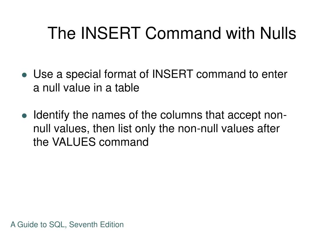 The INSERT Command with Nulls • Use a special format of INSERT command to enter a null value in a table • Identify the names of the columns that accept non-null values, then list only the non-null values after the VALUES command A Guide to SQL, Seventh Edition