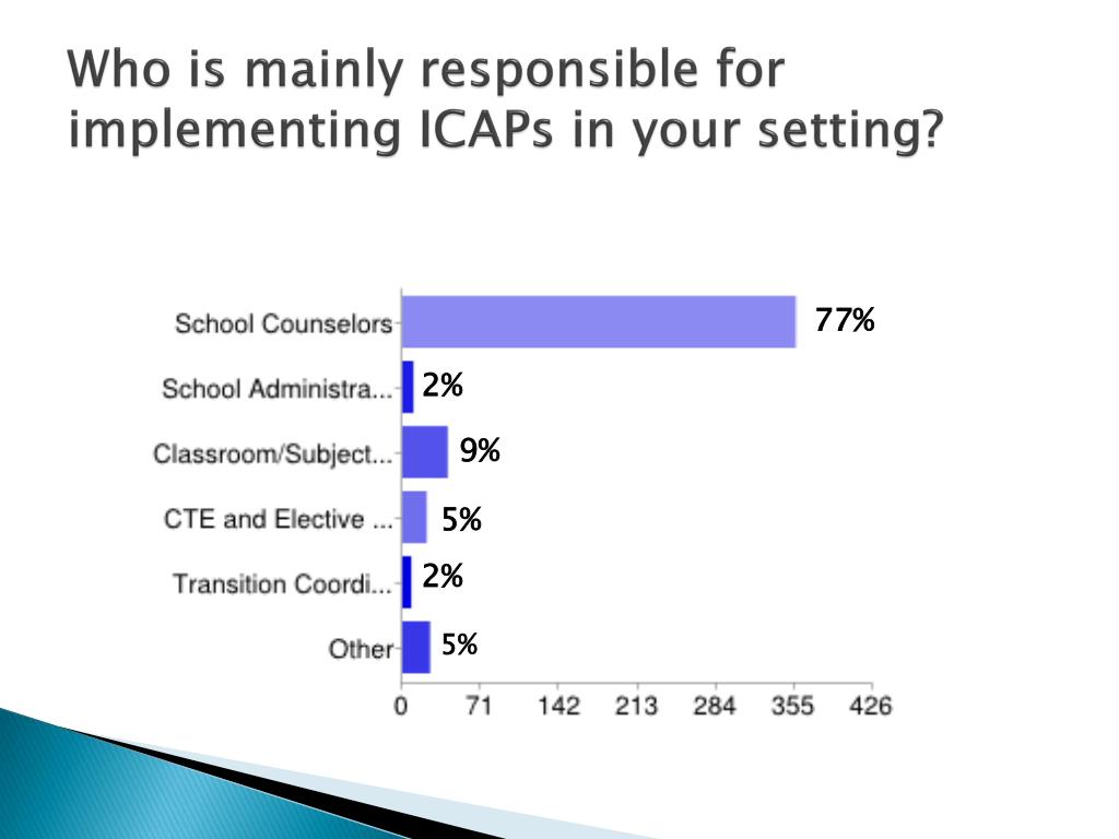 Takeaways • Counselors are responsible for the implementation • Especially at the high school level, counselors feel ICAPs are a valuable tool. • The process is better if it has a champion, particularly if it is the principal. • The process is even better if it is spread across disciplines. • The more meaningful and less “tasks to be completed” the more it is embraced by the student. • Schools want more direction