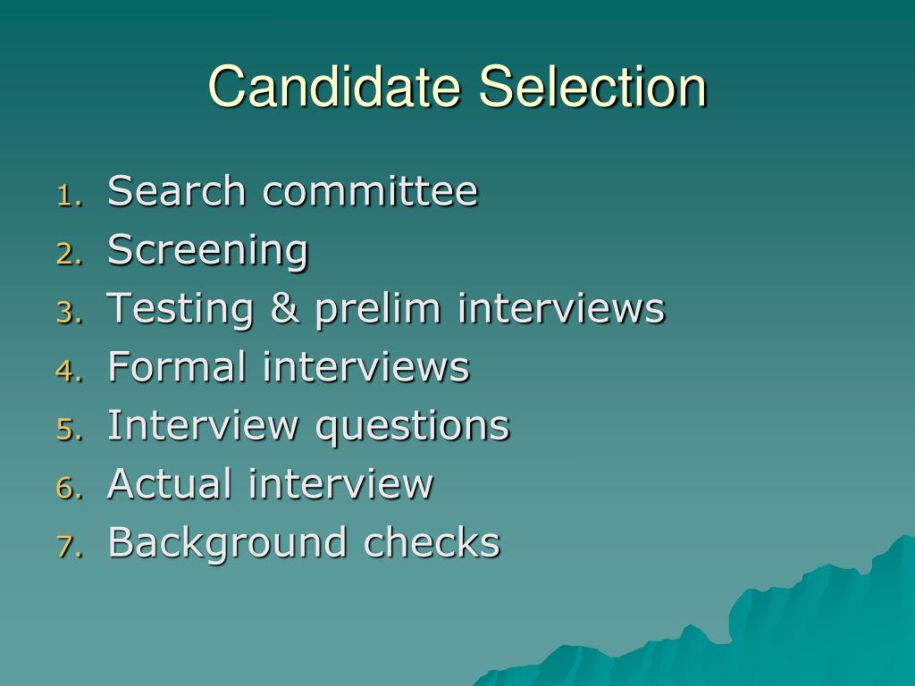 Candidate Selection Search committee Screening Testing & prelim interviews Formal interviews Interview questions Actual interview Background checks