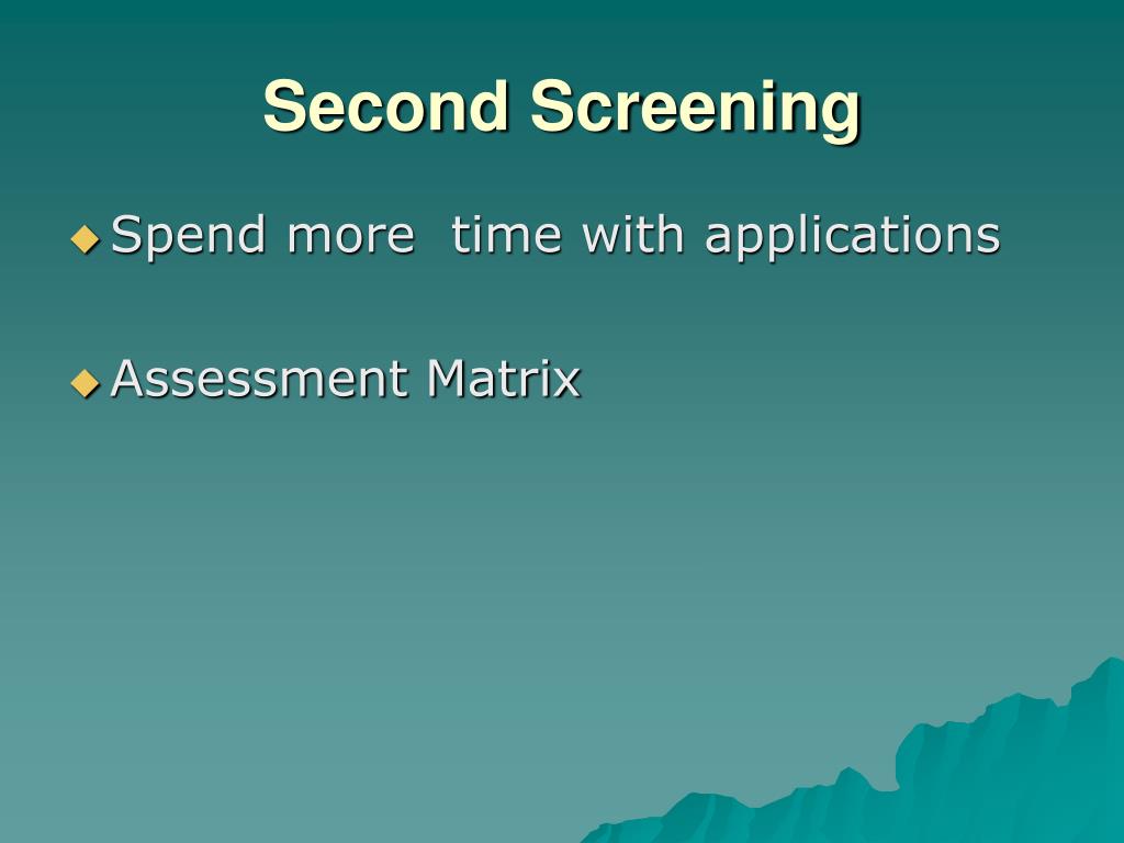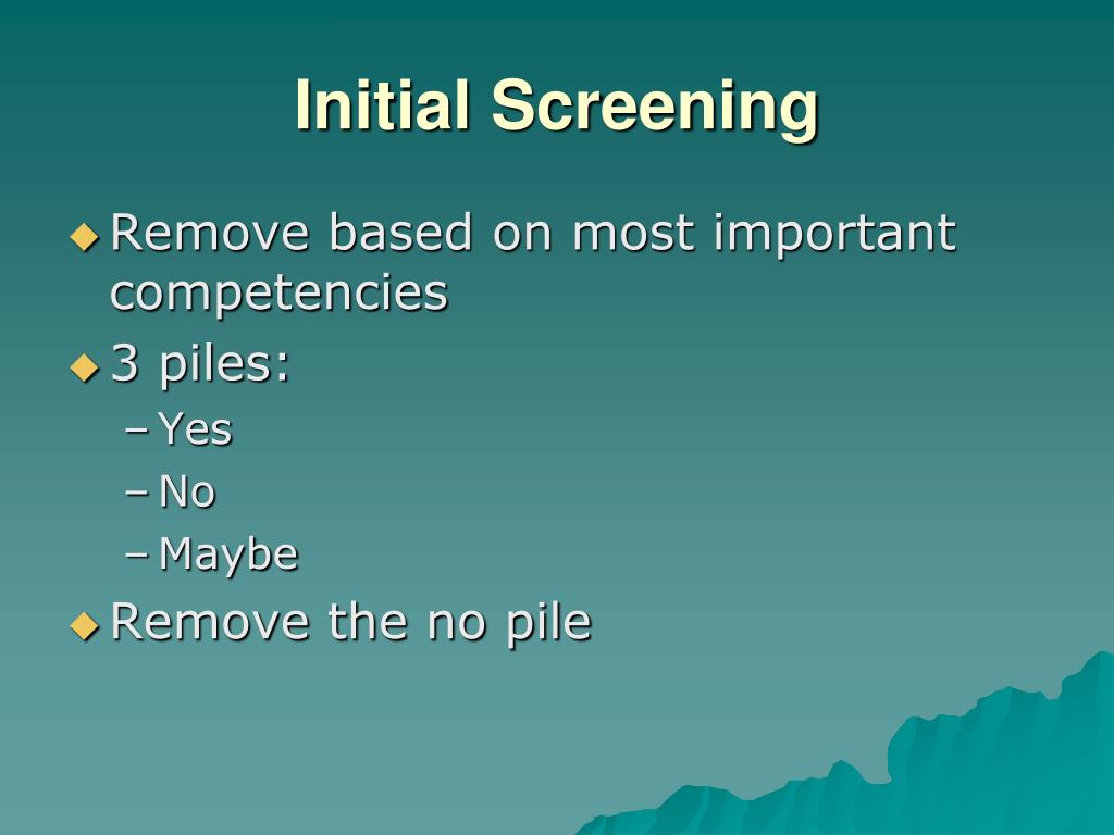 Initial Screening • Remove based on most important competencies • 3 piles: • Yes • No • Maybe • Remove the no pile
