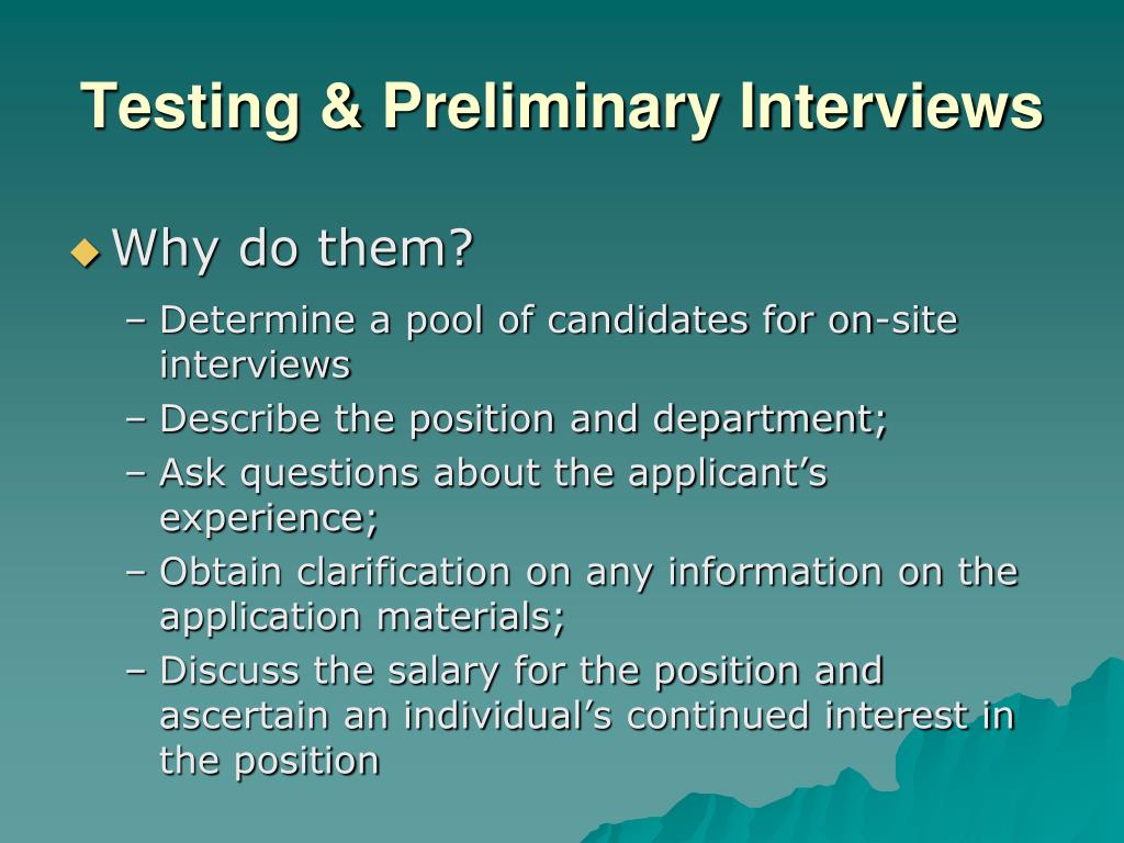 Testing & Preliminary Interviews • Why do them? • Determine a pool of candidates for on-site interviews • Describe the position and department; • Ask questions about the applicant’s experience; • Obtain clarification on any information on the application materials; • Discuss the salary for the position and ascertain an individual’s continued interest in the position