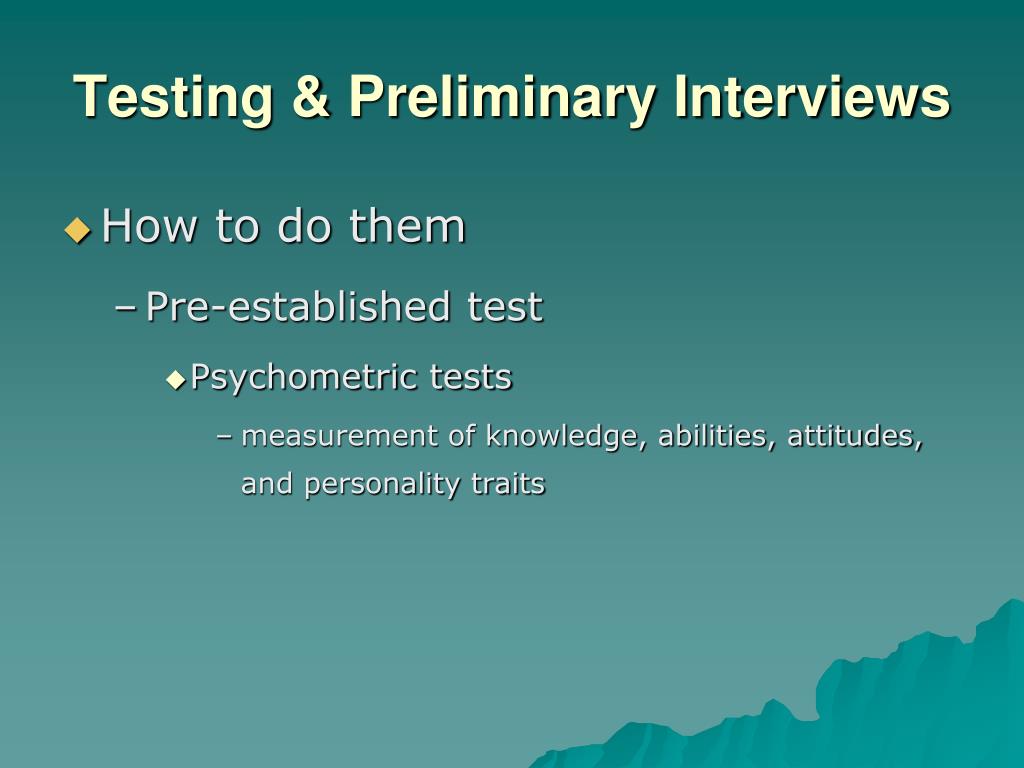 Testing & Preliminary Interviews • How to do them • Pre-established test • Psychometric tests • measurement of knowledge, abilities, attitudes, and personality traits