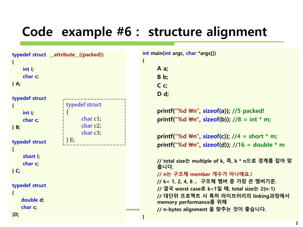 Codeexample #6 : structure alignment int main(intargc, char *args[]) { A a; B b; C c; D d; printf("%d \n", sizeof(a)); //5 packed! printf("%d \n", sizeof(b)); //8 = int * m; printf("%d \n", sizeof(c)); //4 = short * m; printf("%d \n", sizeof(d)); //16 = double * m // total size는 multiple of k, 즉, k * n으로 경계를 잡아 맞춥니다. // n는구조체member 개수가아니에요.! // k= 1, 2, 4, 8 .. 구조체 멤버 중 가장 큰 멤버기준. // 결국 worst case로 k=1일 때, total size는 2(n-1) // 대단위 프로젝트 시특히 라이브러리의 linking과정에서memory performance를 위해 // n-bytes alignment 을 맞추는 것이 좋습니다. } • typedefstruct • { • char c1; • char c2; • char c3; • } E; typedefstruct__attribute__((packed)) { inti; charc; } A; typedefstruct { int i; charc; } B; typedefstruct { shorti; charc; } C; typedefstruct { doubled; charc; }D;