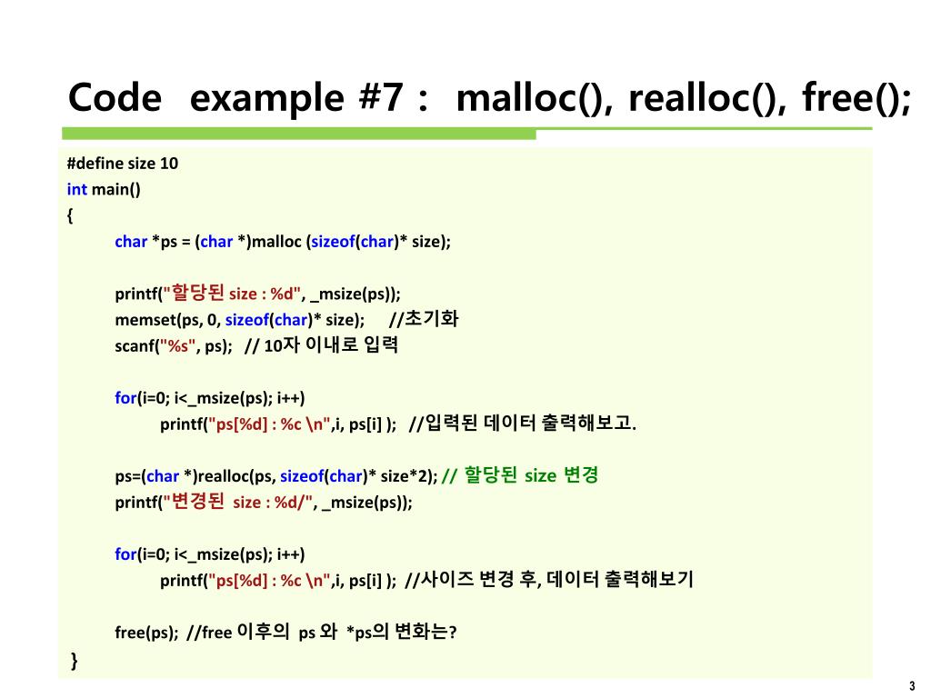 Codeexample #7 : malloc(), realloc(), free(); #define size 10 intmain() { char*ps = (char *)malloc (sizeof(char)* size); printf("할당된 size : %d", _msize(ps)); memset(ps, 0, sizeof(char)* size); //초기화 scanf("%s", ps); // 10자 이내로 입력 for(i=0; i<_msize(ps); i++) printf("ps[%d] : %c \n",i, ps[i] ); //입력된데이터 출력해보고. ps=(char *)realloc(ps, sizeof(char)* size*2); // 할당된 size 변경 printf("변경된 size : %d/", _msize(ps)); for(i=0; i<_msize(ps); i++) printf("ps[%d] : %c \n",i, ps[i] ); //사이즈 변경 후, 데이터 출력해보기 free(ps); //free 이후의 ps와 *ps의 변화는? }