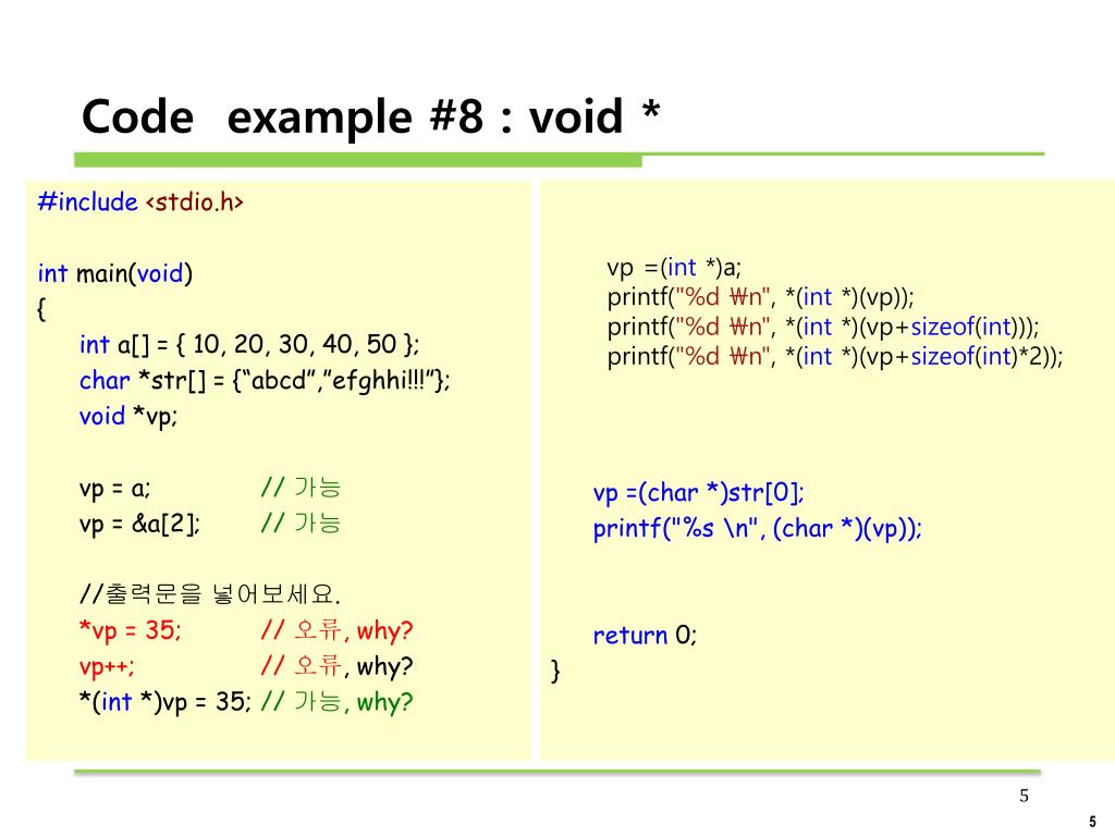 Codeexample #8 : void* • vp=(int *)a; • printf("%d \n", *(int *)(vp)); • printf("%d \n", *(int *)(vp+sizeof(int))); • printf("%d \n", *(int *)(vp+sizeof(int)*2)); vp =(char *)str[0]; printf("%s \n", (char *)(vp)); return 0; } #include<stdio.h> int main(void) { int a[] = { 10, 20, 30, 40, 50 }; char *str[] = {“abcd”,”efghhi!!!”}; void *vp; vp = a; // 가능 vp = &a[2]; // 가능 //출력문을 넣어보세요. *vp = 35;// 오류, why? vp++;// 오류, why? *(int *)vp = 35; // 가능, why?