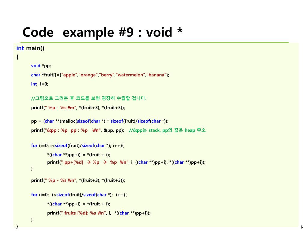 Codeexample #9 : void* int main() { void *pp; char *fruit[]={"apple","orange","berry","watermelon","banana"}; inti=0; //그림으로 그려본 후코드를 보면 굉장히 수월할 겁니다. printf(" %p - %s \n", *(fruit+3), *(fruit+3)); pp = (char **)malloc(sizeof(char *) * sizeof(fruit)/sizeof(char*)); printf("&pp : %p pp : %p \n", &pp, pp); //&pp는 stack, pp의 값은 heap주소 for (i=0; i<sizeof(fruit)/sizeof(char *); i++){ *((char **)pp+i) = *(fruit + i); printf(" pp+[%d] %p %p \n", i, ((char **)pp+i), *((char **)pp+i)); } printf(" %p - %s \n", *(fruit+3), *(fruit+3)); for (i=0; i<sizeof(fruit)/sizeof(char *); i++){ *((char **)pp+i) = *(fruit + i); printf(" fruits [%d]: %s \n", i, *((char **)pp+i)); } }