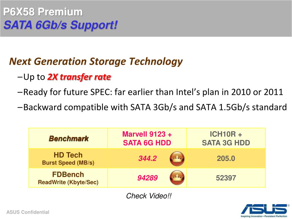 P6X58 PremiumSATA 6Gb/s Support! Next Generation Storage Technology • Up to 2Xtransfer rate • Ready for future SPEC: far earlier than Intel’s plan in 2010 or 2011 • Backward compatible with SATA 3Gb/s and SATA 1.5Gb/s standard Check Video!!