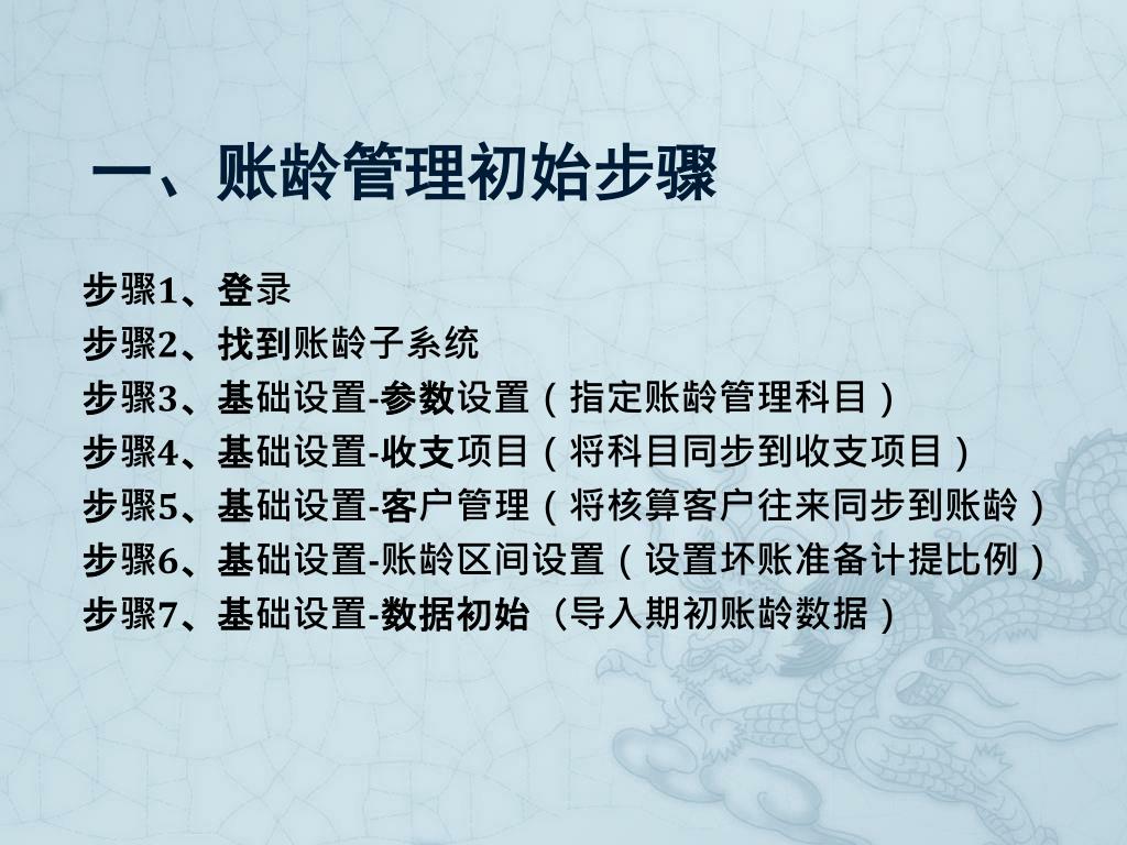 账龄管理 操 作. 步骤 1 、登录 步骤 2 、找到账龄子系统 步骤 3 、基础设置 - 参数设置(指定账龄管理科目) 步骤 4 、基础设置 - 收支项目(将科目同步到收支项目) 步骤 5 、基础设置 - 客户管理(将核算客户往来同步到账龄) 步骤 6 、基础设置 - 账龄区间设置(设置坏账准备计提比例) 步骤 7 、基础设置 - 数据初始(导入期初账龄数据). 一、账龄管理初始步骤. 说在前面. 账龄建议从 1 月开始使用 1 月份使用的好处:会计年度完整,可以查看整年的账龄数据,形成的报表也是整年的数据. 步 骤 1 : 登录业务日期的选择.