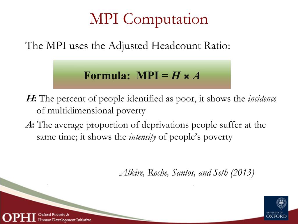 MPI Computation The MPI uses the Adjusted Headcount Ratio: H: The percent of people identified as poor, it shows the incidence of multidimensional poverty A: The average proportion of deprivations people suffer at the same time; it shows the intensity of people’s poverty Alkire, Roche, Santos, and Seth (2013) . Formula: MPI = H × A
