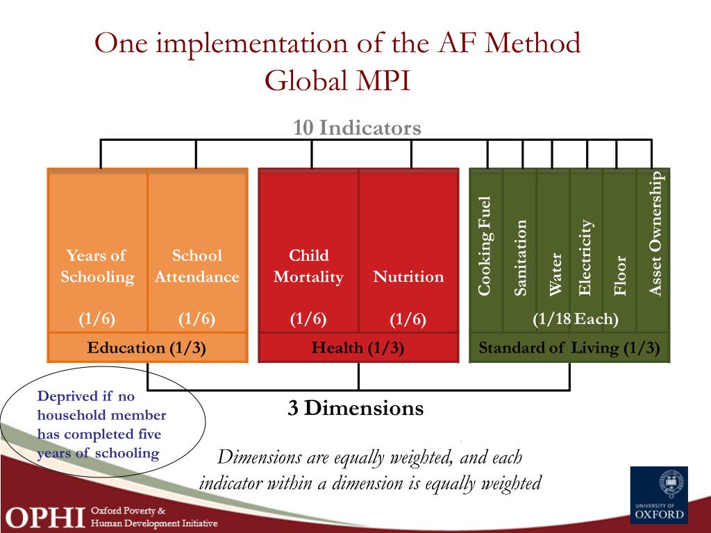 One implementation of the AF Method Global MPI Deprived if no household member has completed five years of schooling Dimensions are equally weighted, and each indicator within a dimension is equally weighted