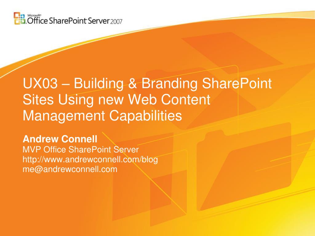 UX03 – Building & Branding SharePoint Sites Using new Web Content Management Capabilities Andrew ConnellMVP Office SharePoint Serverhttp://www.andrewconnell.com/blogme@andrewconnell.com