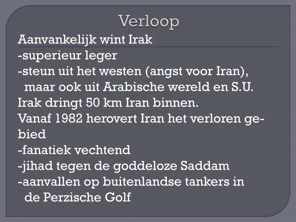 Verloop Aanvankelijk wint Irak -superieur leger -steun uit het westen (angst voor Iran), maar ook uit Arabische wereld en S.U. Irak dringt 50 km Iran binnen. Vanaf 1982 herovert Iran het verloren ge- bied -fanatiek vechtend -jihad tegen de goddeloze Saddam -aanvallen op buitenlandse tankers in de Perzische Golf