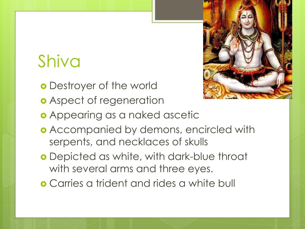 Shiva • Destroyer of the world • Aspect of regeneration • Appearing as a naked ascetic • Accompanied by demons, encircled with serpents, and necklaces of skulls • Depicted as white, with dark-blue throat with several arms and three eyes. • Carries a trident and rides a white bull