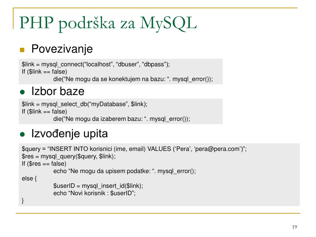 PHP podrška za MySQL • Povezivanje $link = mysql_connect(“localhost”, “dbuser”, “dbpass”); If ($link == false) die(“Ne mogu da se konektujem na bazu: “. mysql_error()); • Izbor baze $link = mysql_select_db(“myDatabase”, $link); If ($link == false) die(“Ne mogu da izaberem bazu: “. mysql_error()); • Izvođenje upita $query = “INSERT INTO korisnici (ime, email) VALUES (‘Pera’, ‘pera@pera.com’)”; $res = mysql_query($query, $link); If ($res == false) echo “Ne mogu da upisem podatke: “. mysql_error(); else { $userID = mysql_insert_id($link); echo “Novi korisnik : $userID”; }