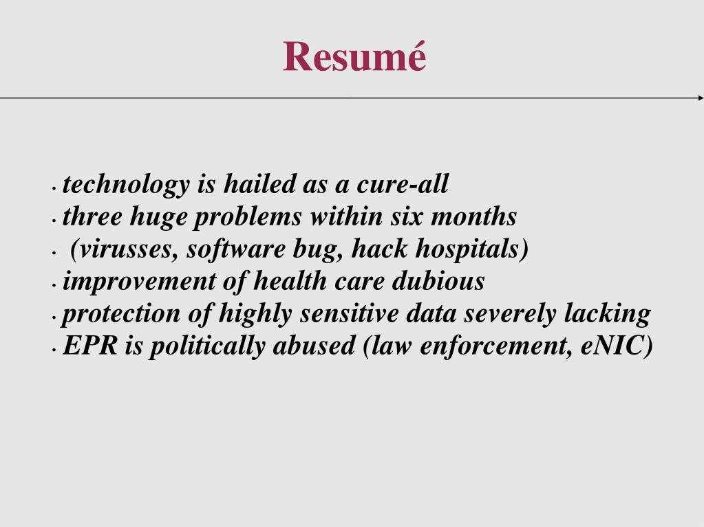 technology is hailed as a cure-all three huge problems within six months (virusses, software bug, hack hospitals) improvement of health care dubious protection of highly sensitive data severely lacking EPR is politically abused (law enforcement, eNIC) Resumé
