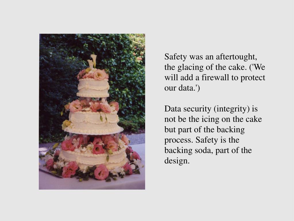 Safety was an aftertought, the glacing of the cake. ('We will add a firewall to protect our data.') Data security (integrity) is not be the icing on the cake but part of the backing process. Safety is the backing soda, part of the design.
