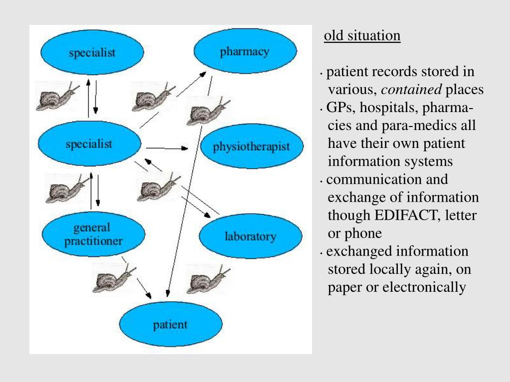old situation • patient records stored in various, contained places • GPs, hospitals, pharma- cies and para-medics all have their own patient information systems • communication and exchange of information though EDIFACT, letter or phone • exchanged information stored locally again, on paper or electronically
