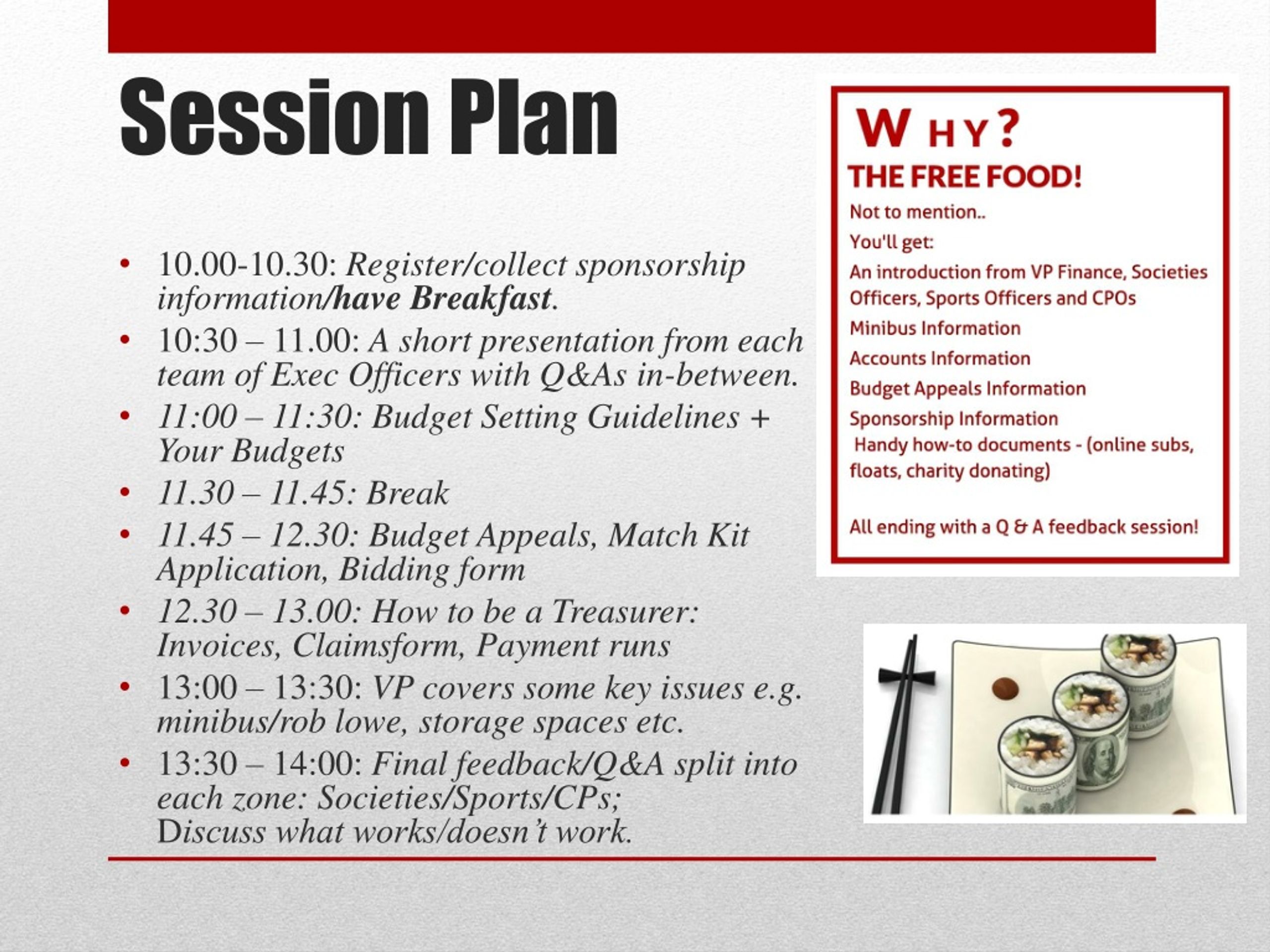 10.00-10.30: Register/collect sponsorship information/have Breakfast. • 10:30 – 11.00: A short presentation from each team of Exec Officers with Q&As in-between. • 11:00 – 11:30: Budget Setting Guidelines + Your Budgets • 11.30 – 11.45: Break • 11.45 – 12.30: Budget Appeals, Match Kit Application, Bidding form • 12.30 – 13.00: How to be a Treasurer: Invoices, Claimsform, Payment runs • 13:00 – 13:30: VP covers some key issues e.g. minibus/rob lowe, storage spaces etc. • 13:30 – 14:00: Final feedback/Q&A split into each zone: Societies/Sports/CPs; Discuss what works/doesn’t work. Session Plan