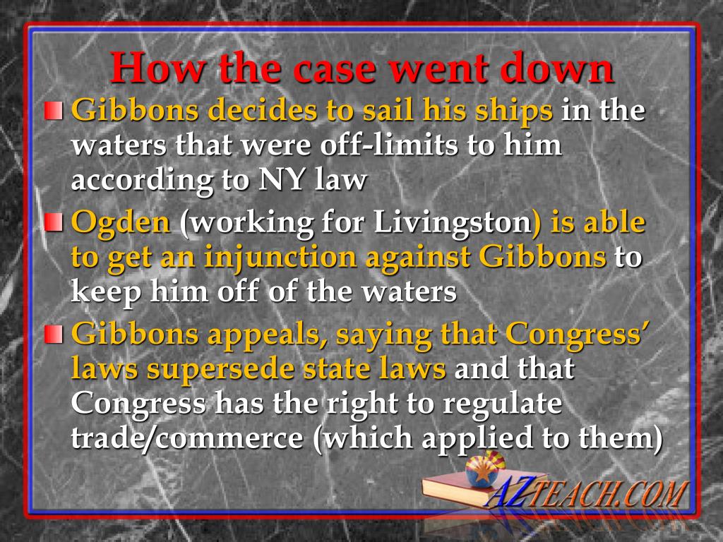 How the case went down • Gibbons decides to sail his ships in the waters that were off-limits to him according to NY law • Ogden (working for Livingston) is able to get an injunction against Gibbons to keep him off of the waters • Gibbons appeals, saying that Congress’ laws supersede state laws and that Congress has the right to regulate trade/commerce (which applied to them)