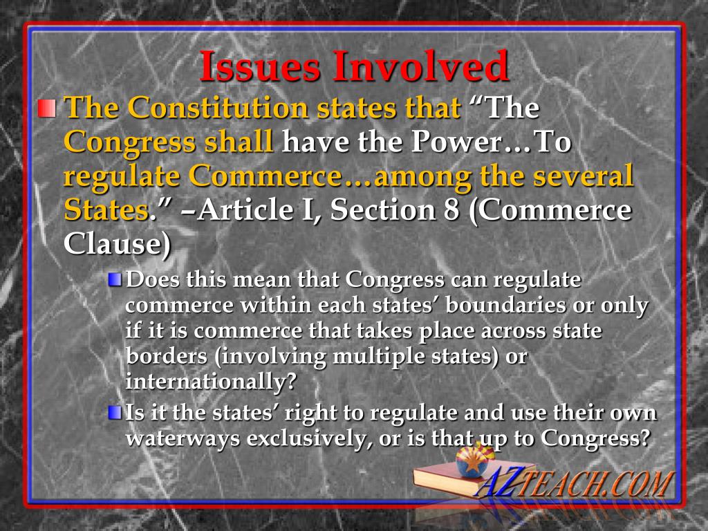 Issues Involved • The Constitution states that “The Congress shall have the Power…To regulate Commerce…among the several States.” –Article I, Section 8 (Commerce Clause) • Does this mean that Congress can regulate commerce within each states’ boundaries or only if it is commerce that takes place across state borders (involving multiple states) or internationally? • Is it the states’ right to regulate and use their own waterways exclusively, or is that up to Congress?