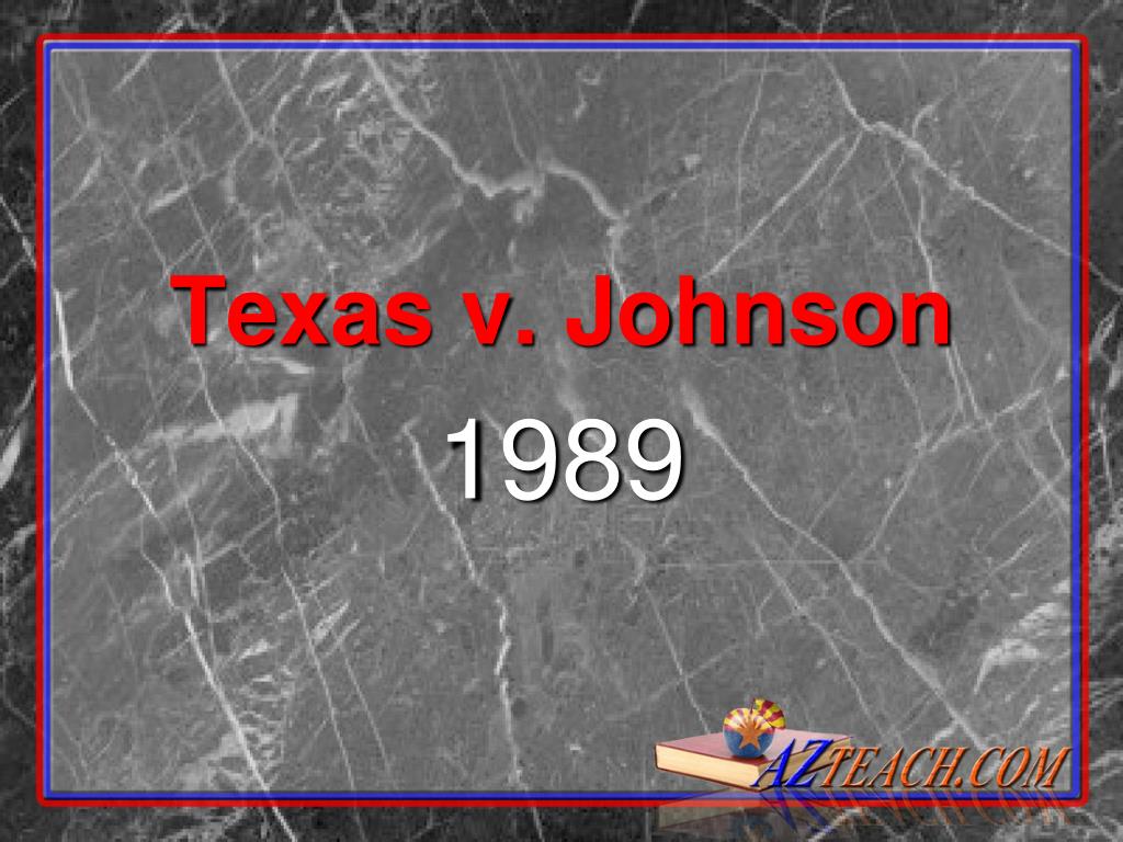 Texas vs. Johnson-1989 • background of the case- • during the 1984 Republican National convention in Dallas, TX, Gregory Johnson joined an organized political protest in opposition to Reagan administration policies and some Dallas based corporations. Demonstrators marched through the streets, chanting their message. As the march progressed, a fellow protestor handed Johnson an American flag that had been taken from a flag pole at one of their protest locations.