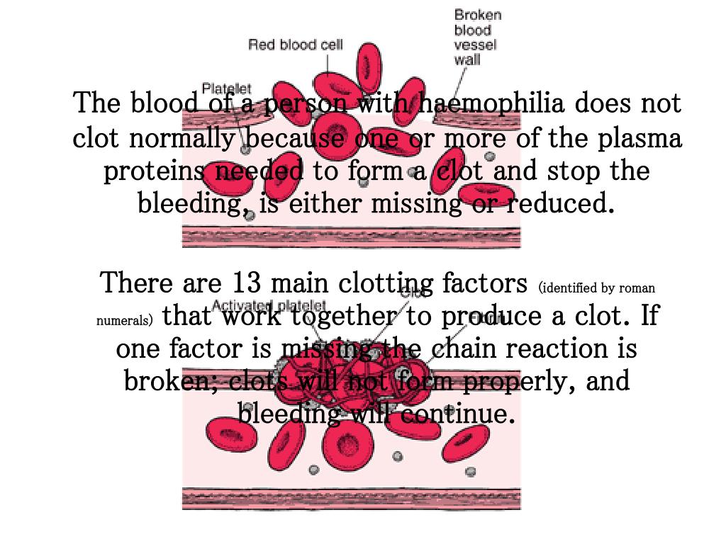 The blood of a person with haemophilia does not clot normally because one or more of the plasma proteins needed to form a clot and stop the bleeding, is either missing or reduced. There are 13 main clotting factors (identified by roman numerals) that work together to produce a clot. If one factor is missing the chain reaction is broken; clots will not form properly, and bleeding will continue.