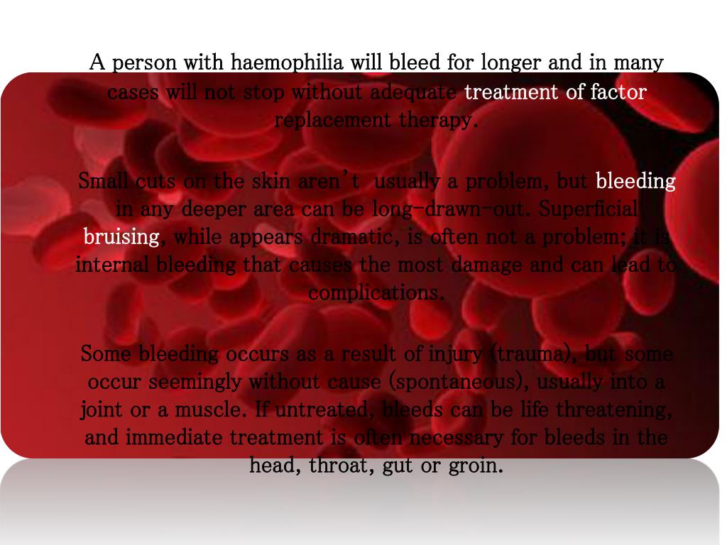 A person with haemophilia will bleed for longer and in many cases will not stop without adequate treatment of factor replacement therapy. Small cuts on the skin aren’t usually a problem, but bleeding in any deeper area can be long-drawn-out. Superficial bruising, while appears dramatic, is often not a problem; it is internal bleeding that causes the most damage and can lead to complications. Some bleeding occurs as a result of injury (trauma), but some occur seemingly without cause (spontaneous), usually into a joint or a muscle. If untreated, bleeds can be life threatening, and immediate treatment is often necessary for bleeds in the head, throat, gut or groin.