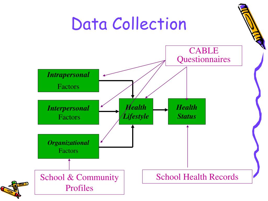 Intrapersonal Factors HealthLifestyle Health Status Interpersonal Factors Organizational Factors Data Collection CABLE Questionnaires School Health Records School & Community Profiles