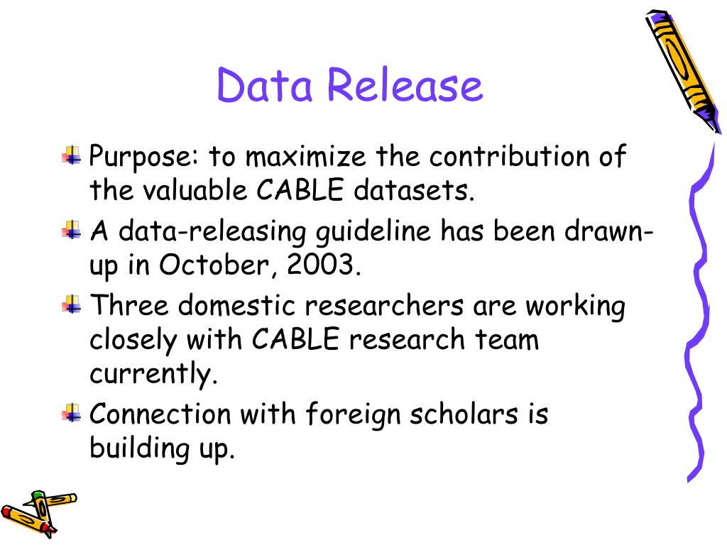 Data Release • Purpose: to maximize the contribution of the valuable CABLE datasets. • A data-releasing guideline has been drawn-up in October, 2003. • Three domestic researchers are working closely with CABLE research team currently. • Connection with foreign scholars is building up.