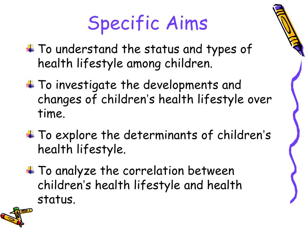 Specific Aims • To understand the status and types of health lifestyle among children. • To investigate the developments and changes of children’s health lifestyle over time. • To explore the determinants of children’s health lifestyle. • To analyze the correlation between children’s health lifestyle and health status.