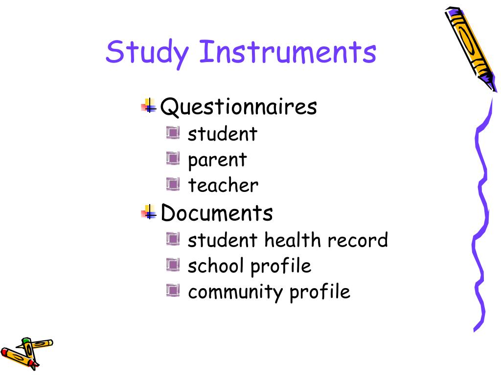 Study Instruments • Questionnaires • student • parent • teacher • Documents • student health record • school profile • community profile
