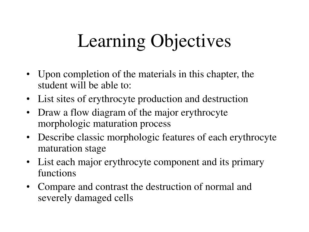 Learning Objectives • Upon completion of the materials in this chapter, the student will be able to: • List sites of erythrocyte production and destruction • Draw a flow diagram of the major erythrocyte morphologic maturation process • Describe classic morphologic features of each erythrocyte maturation stage • List each major erythrocyte component and its primary functions • Compare and contrast the destruction of normal and severely damaged cells