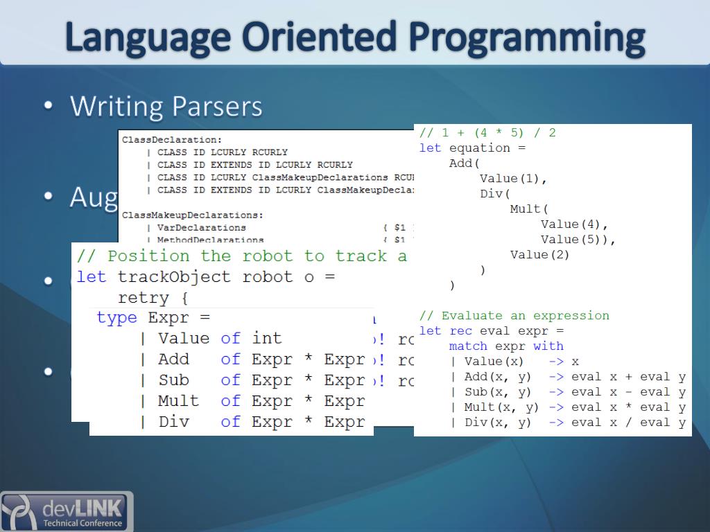 Language Oriented Programming • Writing Parsers • Augmenting F# Code • Creating New Languages • Quotations (Expression Trees)