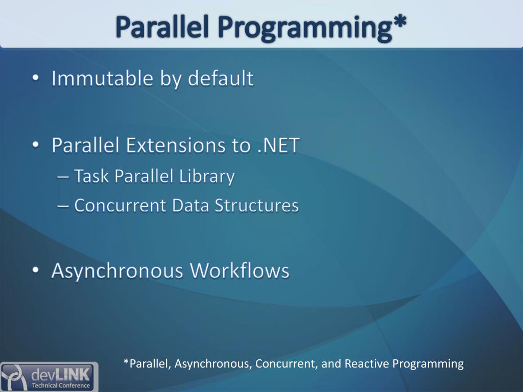 Parallel Programming* • Immutable by default • Parallel Extensions to .NET • Task Parallel Library • Concurrent Data Structures • Asynchronous Workflows *Parallel, Asynchronous, Concurrent, and Reactive Programming