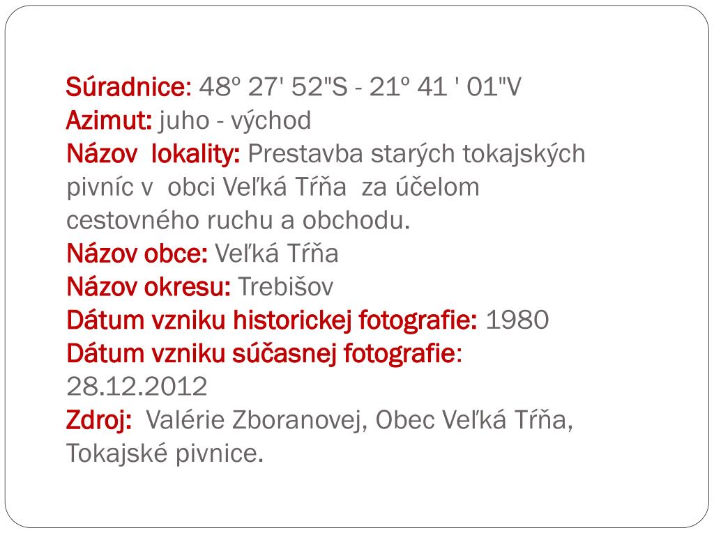 Súradnice: 48º 27' 52"S - 21º 41 ' 01"VAzimut: juho - východNázov lokality: Prestavba starých tokajských pivníc v obci Veľká Tŕňa za účelom cestovného ruchu a obchodu.Názov obce: Veľká TŕňaNázov okresu: TrebišovDátum vzniku historickej fotografie:1980Dátum vzniku súčasnej fotografie: 28.12.2012Zdroj: Valérie Zboranovej, Obec Veľká Tŕňa, Tokajské pivnice.