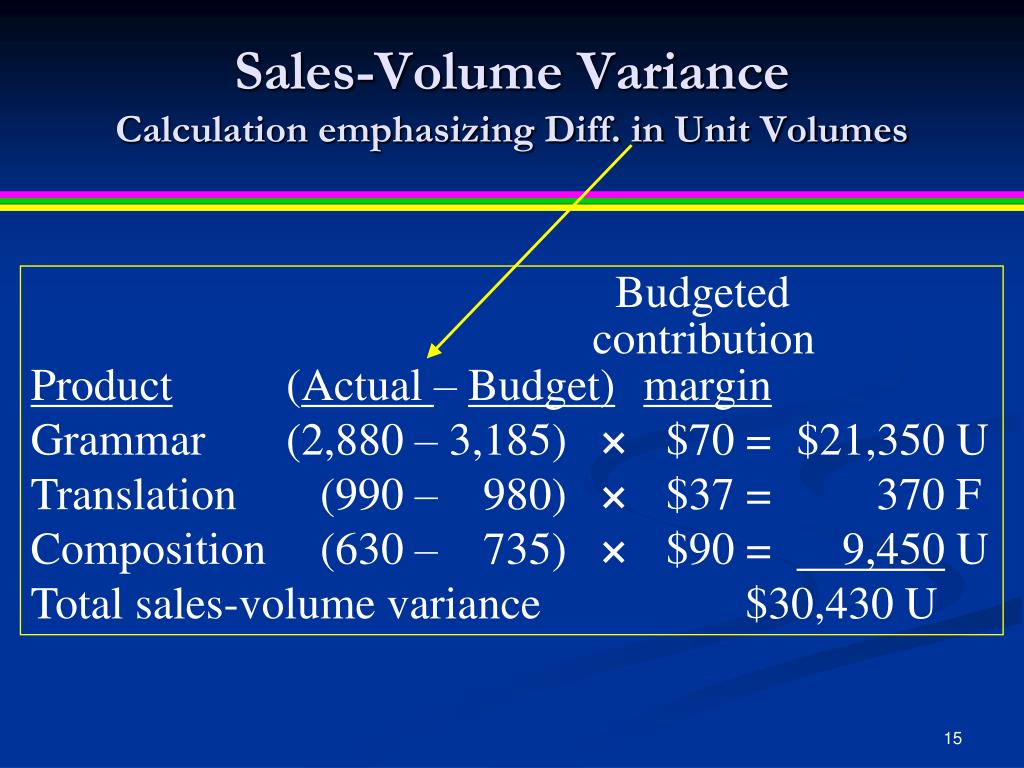 Sales-Volume VarianceCalculation emphasizing Diff. in Unit Volumes Budgeted contribution Product (Actual – Budget)margin Grammar (2,880 – 3,185) × $70 = $21,350 U Translation (990 – 980) × $37 = 370 F Composition (630 – 735) × $90 = 9,450 U Total sales-volume variance $30,430 U