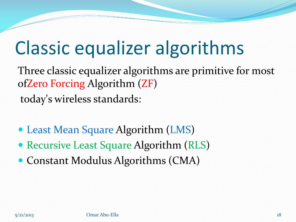 Classic equalizer algorithms Three classic equalizer algorithms are primitive for most ofZero Forcing Algorithm(ZF) today's wireless standards: • Least Mean Square Algorithm (LMS) • Recursive Least Square Algorithm (RLS) • Constant Modulus Algorithms (CMA) Omar Abu-Ella