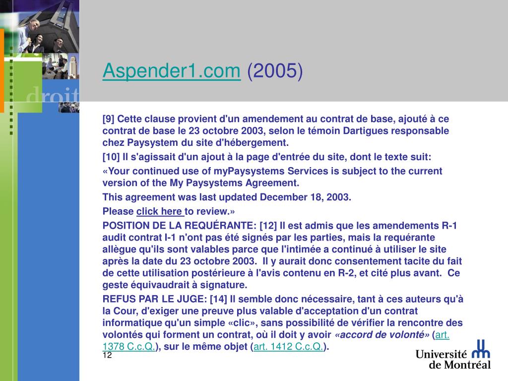 Aspender1.com (2005) • [9] Cette clause provient d'un amendement au contrat de base, ajouté à ce contrat de base le 23 octobre 2003, selon le témoin Dartigues responsable chez Paysystem du site d'hébergement. • [10] Il s'agissait d'un ajout à la page d'entrée du site, dont le texte suit: • «Your continued use of myPaysystems Services is subject to the current version of the My Paysystems Agreement. • This agreement was last updated December 18, 2003. • Please click here to review.» • POSITION DE LA REQUÉRANTE: [12] Il est admis que les amendements R-1 audit contrat I-1 n'ont pas été signés par les parties, mais la requérante allègue qu'ils sont valables parce que l'intimée a continué à utiliser le site après la date du 23 octobre 2003. Il y aurait donc consentement tacite du fait de cette utilisation postérieure à l'avis contenu en R-2, et cité plus avant. Ce geste équivaudrait à signature. • REFUS PAR LE JUGE: [14] Il semble donc nécessaire, tant à ces auteurs qu'à la Cour, d'exiger une preuve plus valable d'acceptation d'un contrat informatique qu'un simple «clic», sans possibilité de vérifier la rencontre des volontés qui forment un contrat, où il doit y avoir «accord de volonté» (art. 1378 C.c.Q.), sur le même objet (art. 1412 C.c.Q.).
